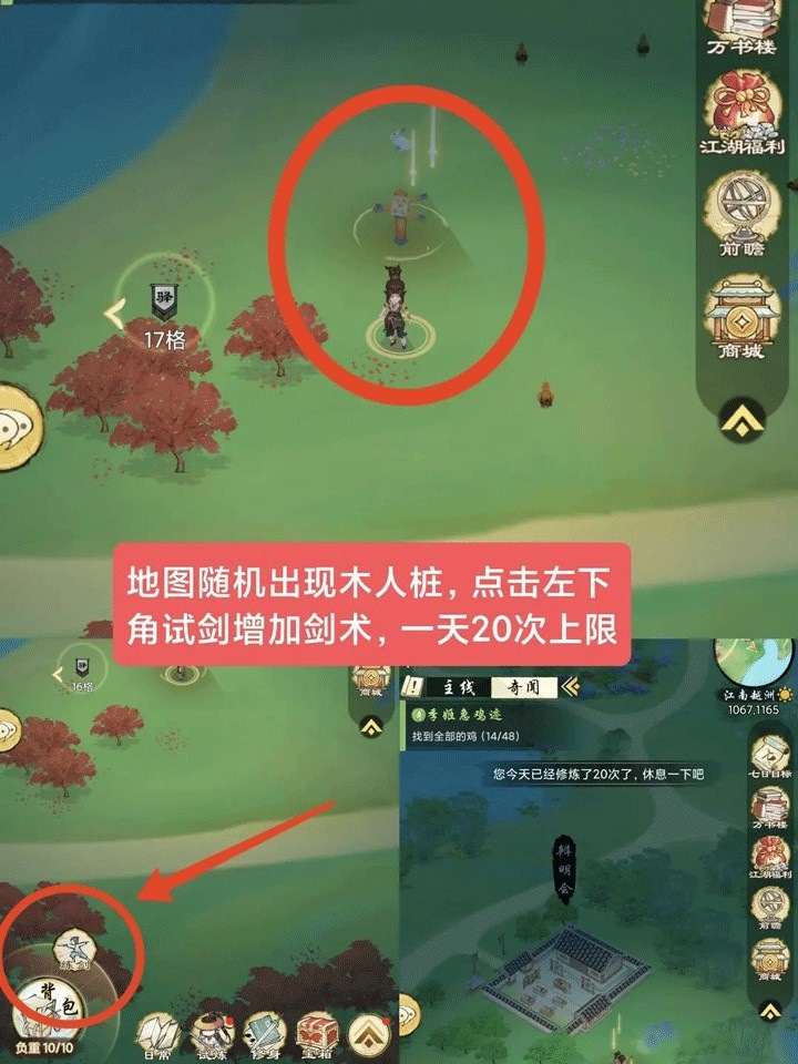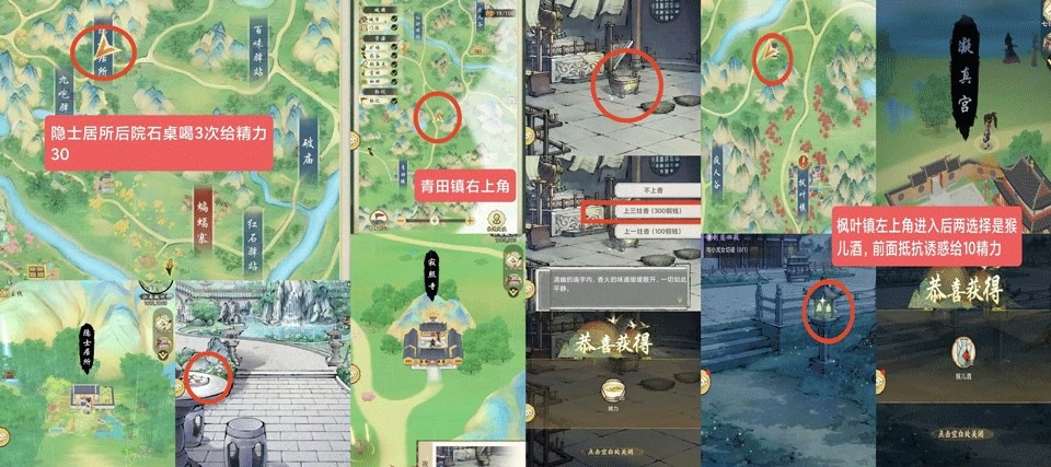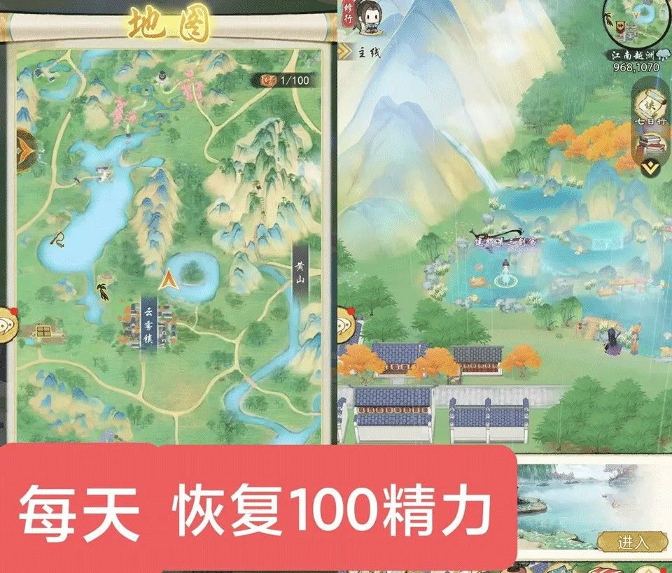 地图上的温泉可以恢复精力,云雾镇和右下角的望柳亭都有温泉,每次可以恢复10点精力。