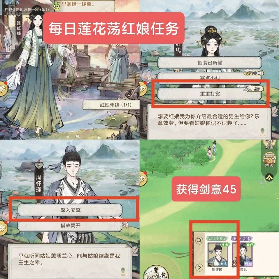 每天可以在莲花荡做3次红娘任务,完成后可提高好感度并获得剑意。